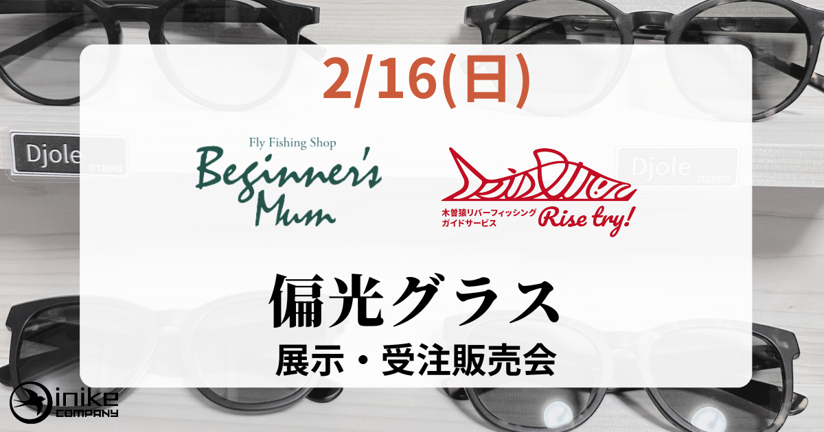 2月16日(日)、ビギナーズ・マム様におきまして偏光サングラスの展示、受注販売会を行ないます。処方箋等お持ち戴ければ度入りレンズでの製作も可能です。尚、当日は長野県木曽地域でフィシングガイドをされているRise try! 高橋氏によるタイイングデモも予定されて居ります。皆様、お誘い合わせてご来店下さい。